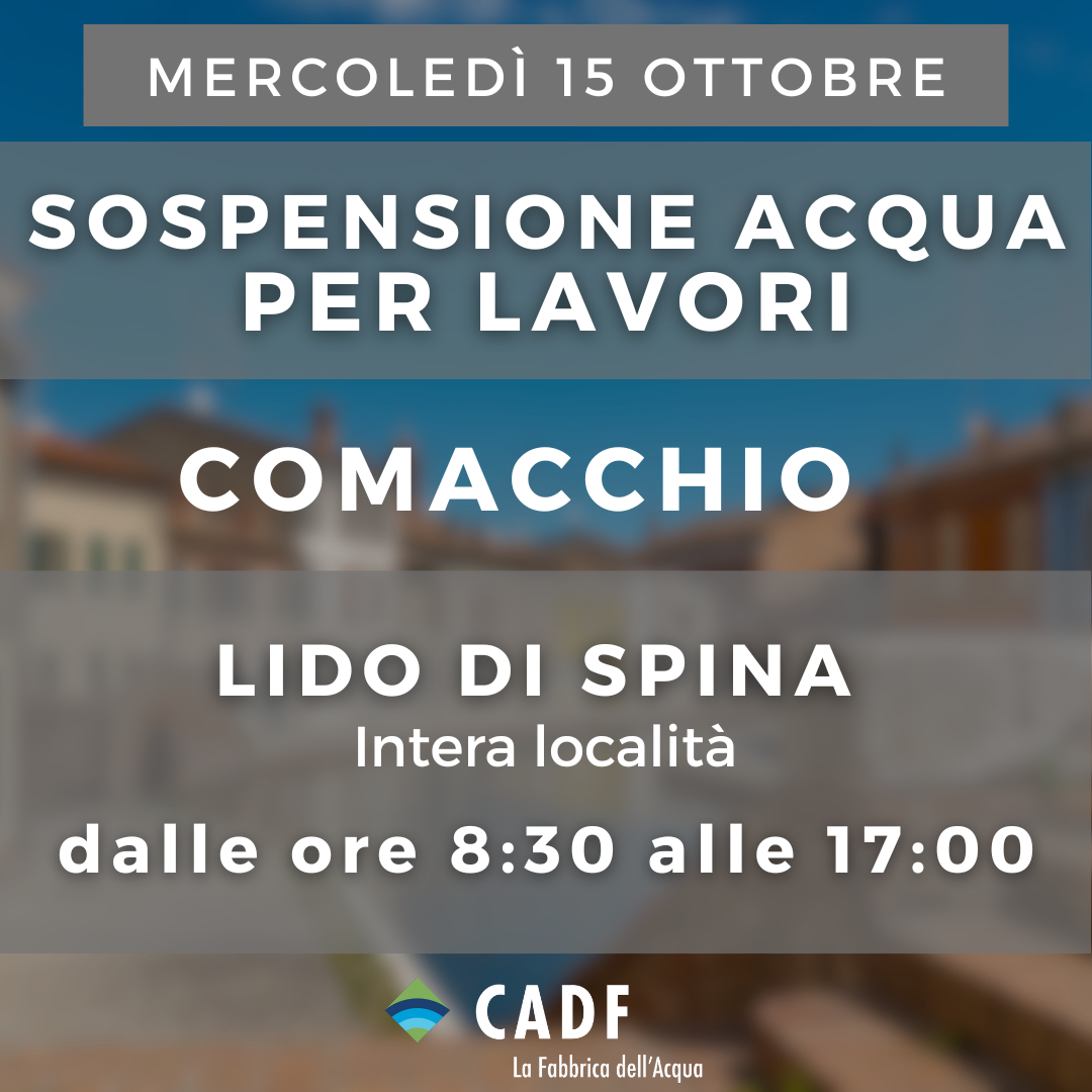 Si comunica che per lavori di manutenzione alla rete idrica, sospenderemo l’erogazione di acqua potabile, nella giornata di 𝗺𝗲𝗿𝗰𝗼𝗹𝗲𝗱𝗶̀ 𝟭𝟱 𝗼𝘁𝘁𝗼𝗯𝗿𝗲 𝟮𝟬𝟮𝟱 𝗱𝗮𝗹𝗹𝗲 𝗼𝗿𝗲 𝟴:𝟯𝟬 𝗮𝗹𝗹𝗲 𝗼𝗿𝗲 𝟭𝟳.𝟬𝟬 in Comune di Comacchio